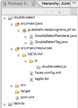 double-selectコンポーネントを構成するファイルがこれで一通り揃った。さっそくパッケージングを行おう。まず,double-selectプロジェクト内が以下のようになっていることを確認して欲しい。